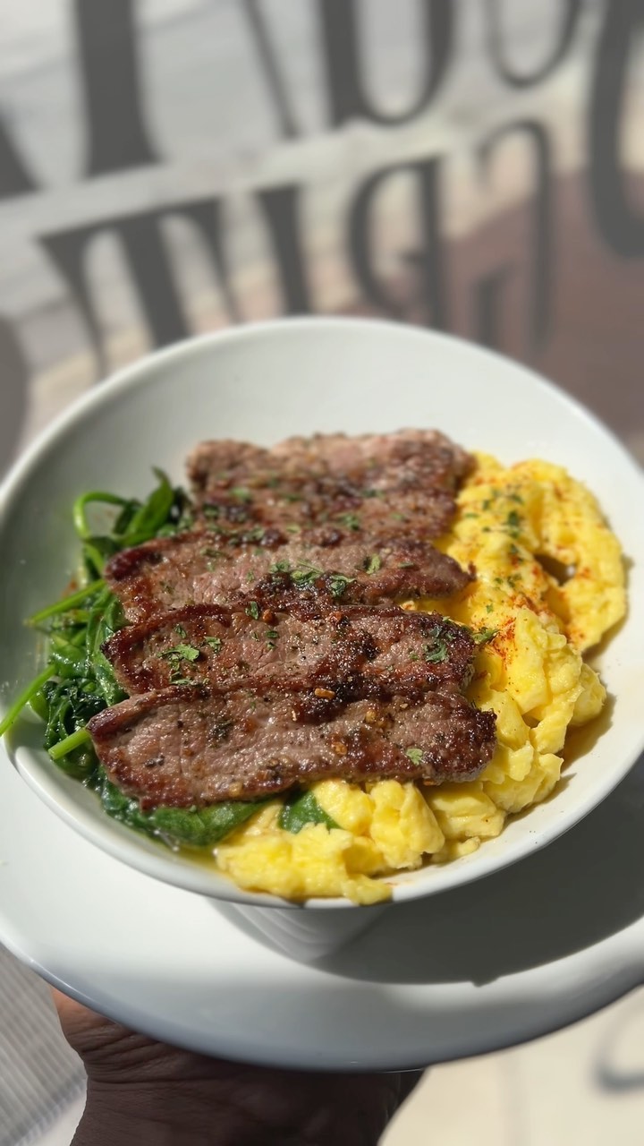 Cheese grits, flat iron steak, fried eggs, and sautéed spinach