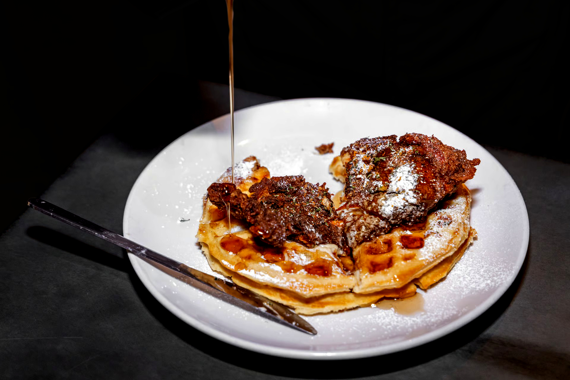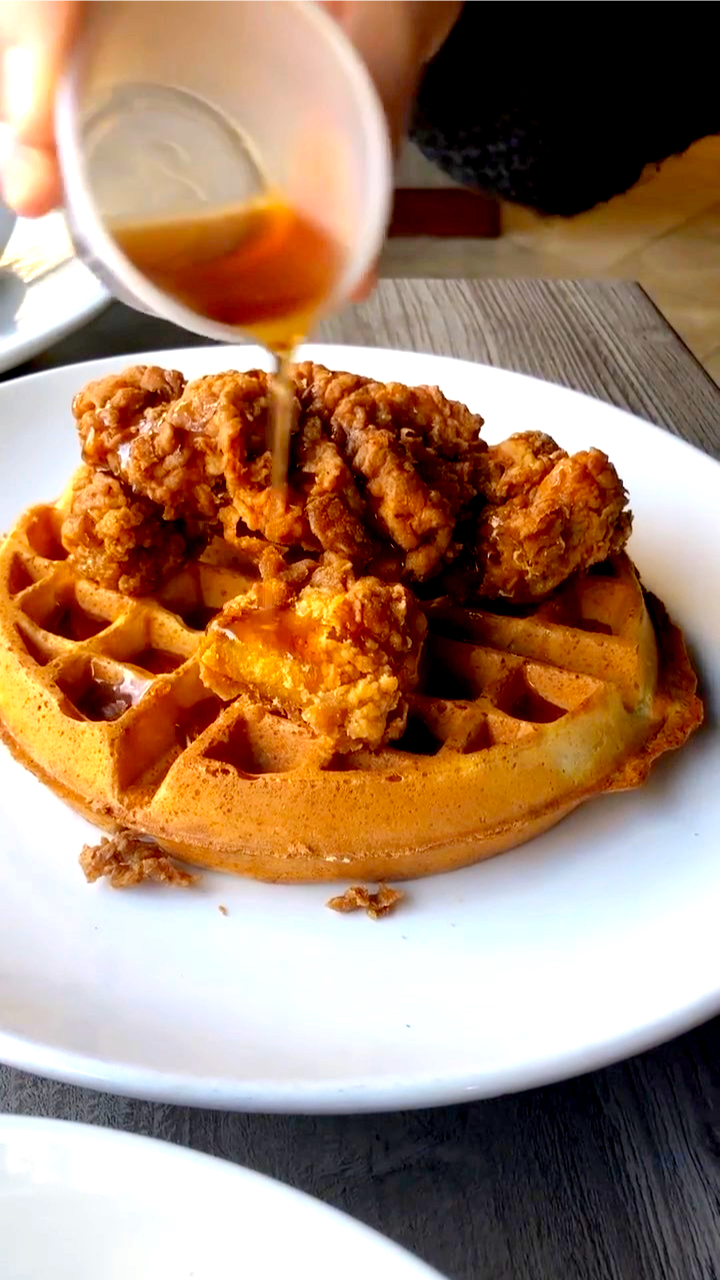 Southern-fried chicken breast, Belgian waffle, and spicy maple syrup