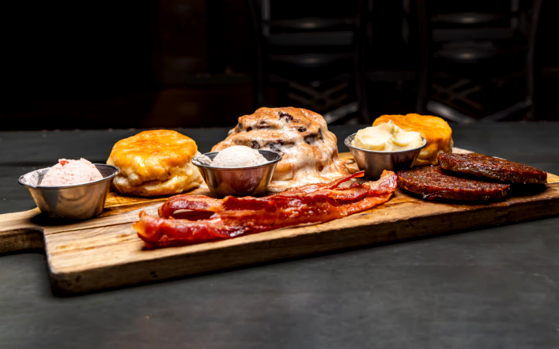 Fresh made biscuits served with honey butter, cinnamon sugar butter, strawberry butter, preserves, sausage, and bacon